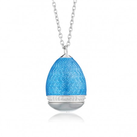 Ce modèle offre une chaine maille forçat de 45cm avec fermoir mousqueton ainsi qu’un pendentif en forme d’œuf de 2cm, de couleur bleu clair et aux motifs géométriques.