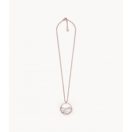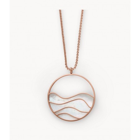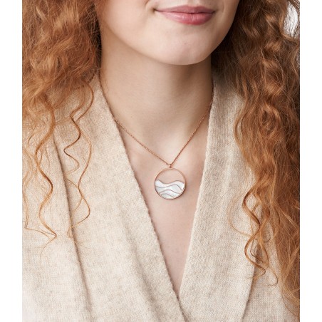 Il se compose d'une chaine en acier doré rose en maille vénitienne ainsi que d'un pendentif rond doré rose possédant un motif vague dans empli de nacre.