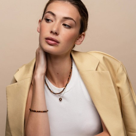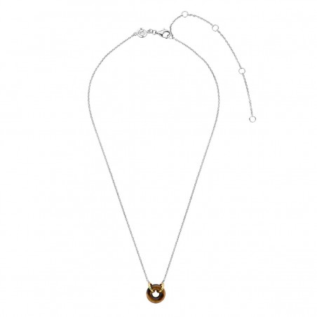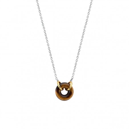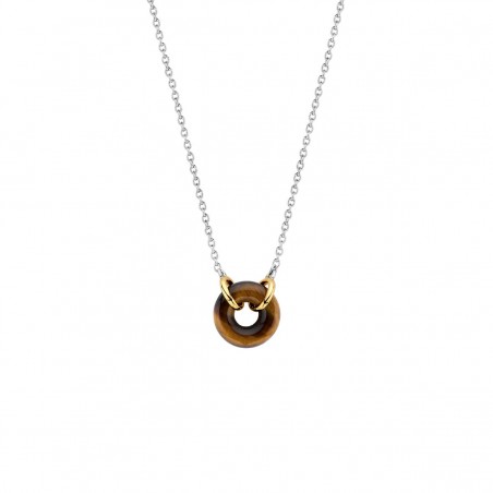 Une chaine maille forçat se terminant d'un coté par un fermoir mousqueton et de l’autre par deux anneau dorés enserrant un cercle d’œil de tigre aux magnifiques couleurs mordorées.