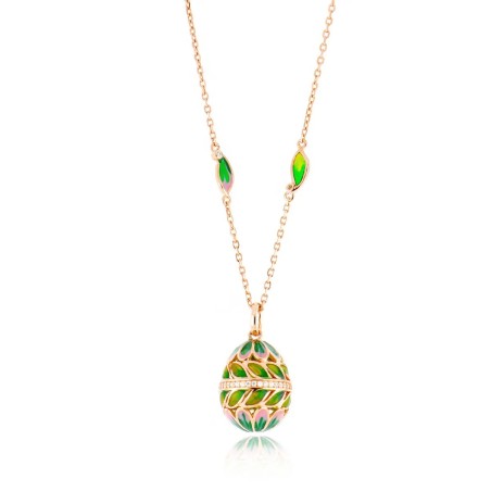 Une chaine classique et intemporelle en maille forçat se terminant par un fermoir mousqueton maintienne un ouvrage délicat de forme ovoïde.