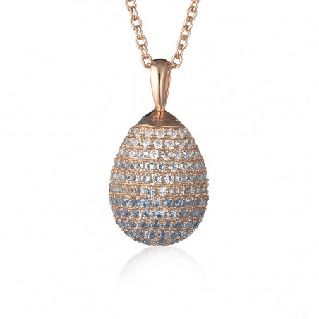 Sa chaine maille forçat est doré rose 50cm et soutiens un pendentif de forme ovoïde serti d’oxyde de zirconium aux différentes nuances de bleu en rang verticale parallèle serré.