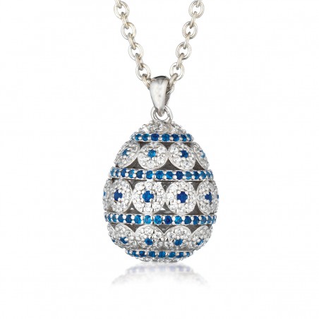 Ce pendentif, aux teintes douces grises argent et bleutés, affiche une forme d’œuf ajouré aux lignes horizontales parallèles enserrant des motifs arrondis sertis d’oxyde de zirconium incolore et bleu.