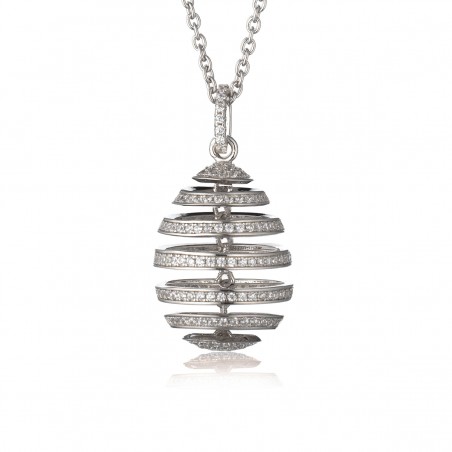 Sa chaine affiche une maille forçat de 50cm avec fermoir mousqueton. Son pendentif en forme d’œuf est représenté comme une spirale aux bandes serties d’oxyde de zirconium tournant sur leur axe.