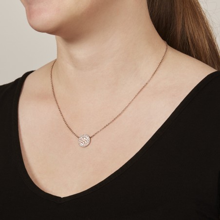 Collier Fossil en acier, finition polie, nacre rose, cristaux transparents, fermoir mousqueton. Taille du collier : 45 cm