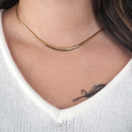 Ce modèle se compose d'une maille anglaise et d'un fermoir mousqueton d'une épaisseur de 2.5mm et d'une longueur de 42 cm.