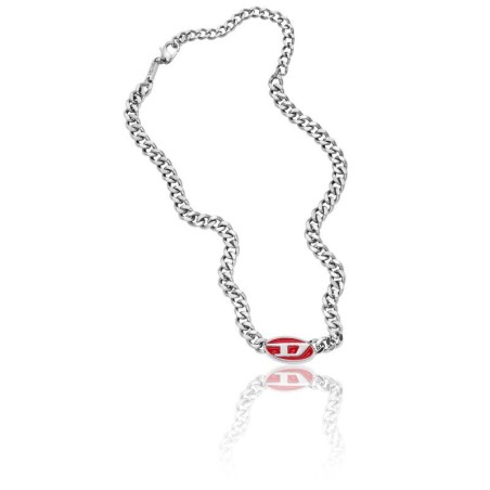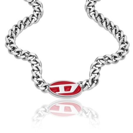 Collier Mixte Diesel maille gourmette en acier argenté et émail rouge motif "D"