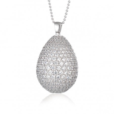 Une chaine maille marseillaise de 80cm se terminant par un fermoir mousqueton maintient un ouvrage délicat de forme ovoïde. Complètement sertis d’oxyde de zirconium cet œuf en dissimule un autre celui-ci tout en dentelle d’argent.
