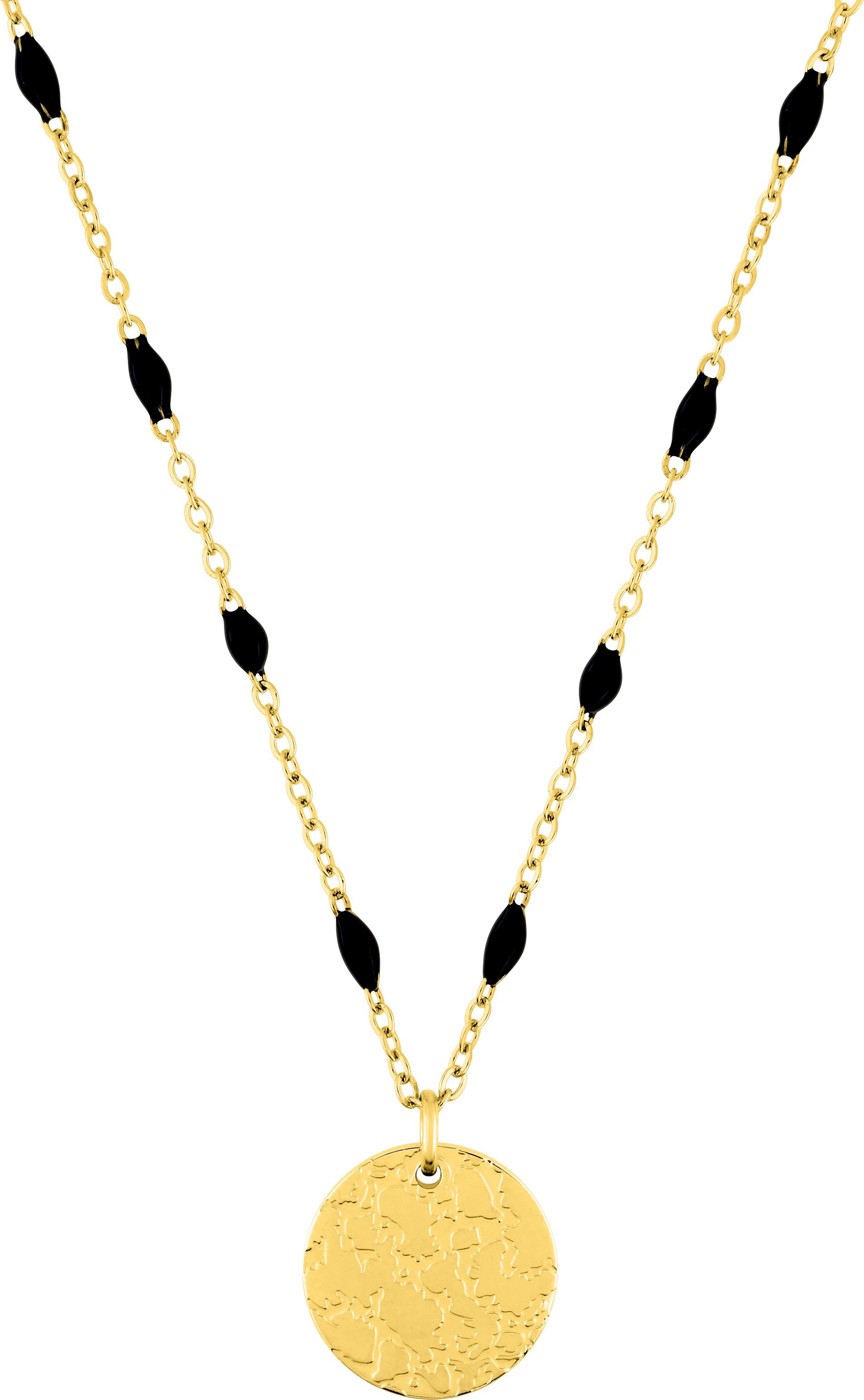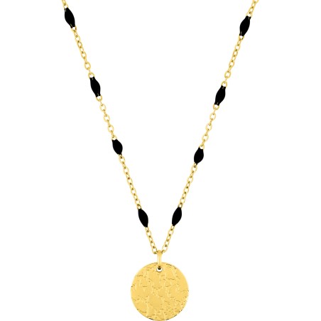 Collier Pendentif plaque ronde martelée Amporelle en acier doré avec époxy noir sur la chaîne