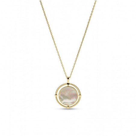 Ce délicat collier nacré blanc et acier inoxydable doré affiche un motif rond servant d'écrin à un élément nacré mobile pour un porté lumineux et délicat.