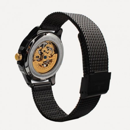 Elle possède un boitier rond de 42mm et un bracelet en acier inoxydable noir.