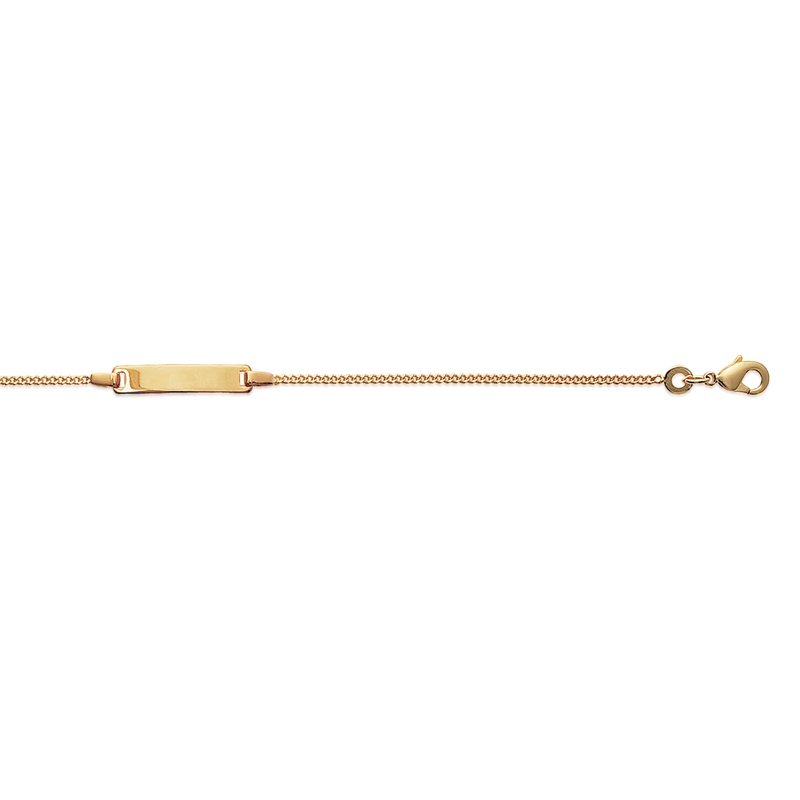 Ce modèle affiche une maille gourmette d'une longueur de 15.5 cm enserrant une plaque rectangulaire de 2cm par 0.4 cm.