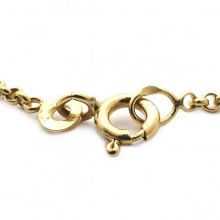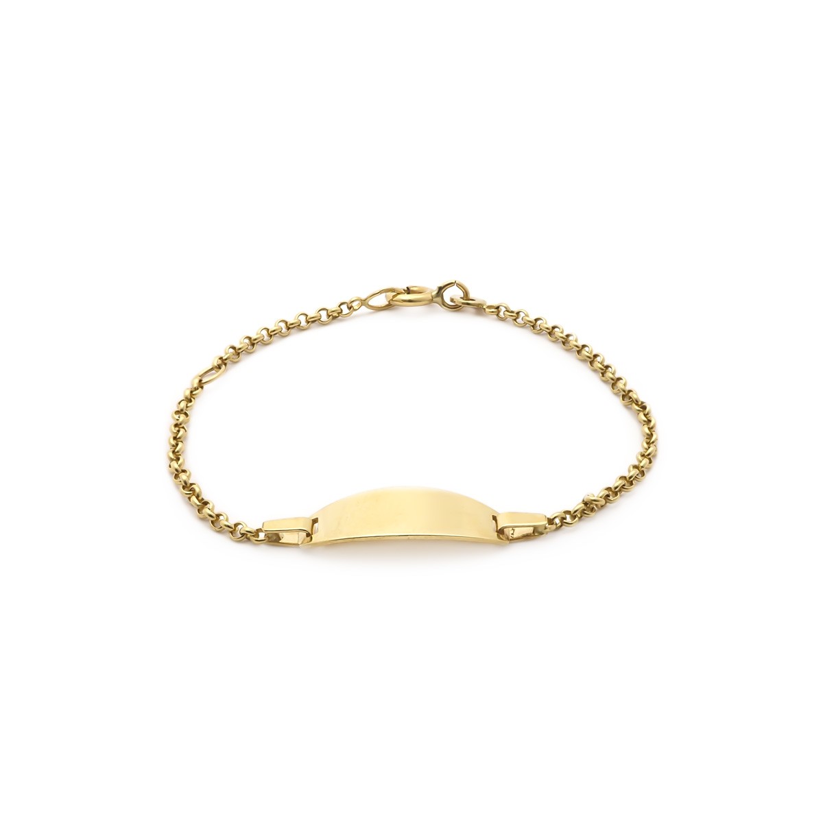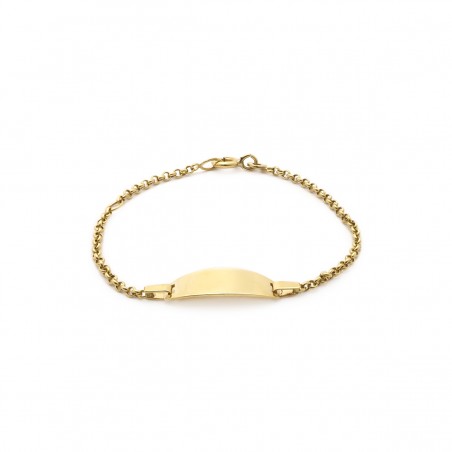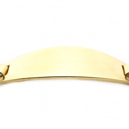 Cette gourmette, en or jaune 750/000, vous révèle une plaque de forme ovale à graver soutenue par une chaine jaseron.