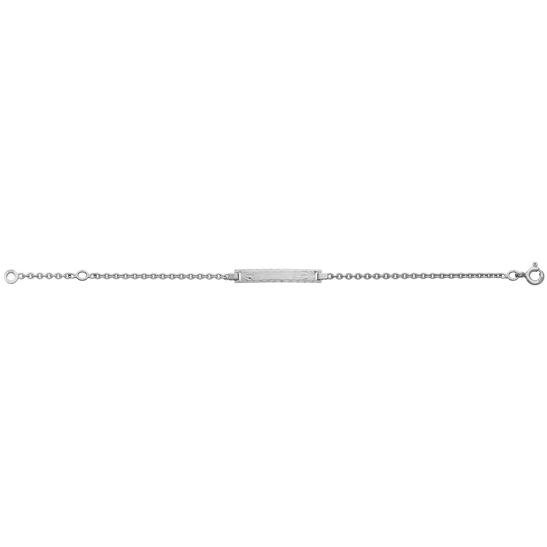 Cette identité bébé en or blanc 9 carats à une chaine forçat et une plaque ciselée. Pensez à faire graver ce bijou !