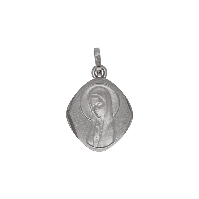 De forme ovale, la médaille en or blanc, revêt un aspect satiné sublimé par la silhouette de la vierge et d'une bordure en or brillant.