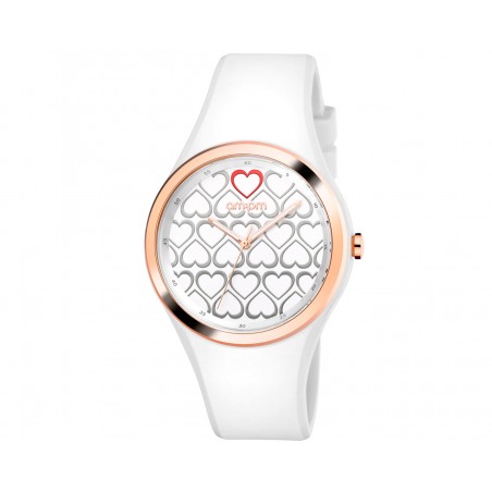 Son cadran blanc à motif cœurs met en évidence les aiguilles blanches bordées de doré rose pour une lecture optimale.