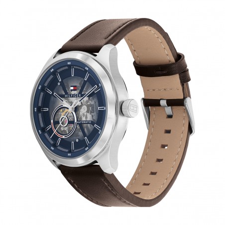 Le cadran laisse apparaitre son mécanisme en transparence et des index bâton et trois aiguilles.