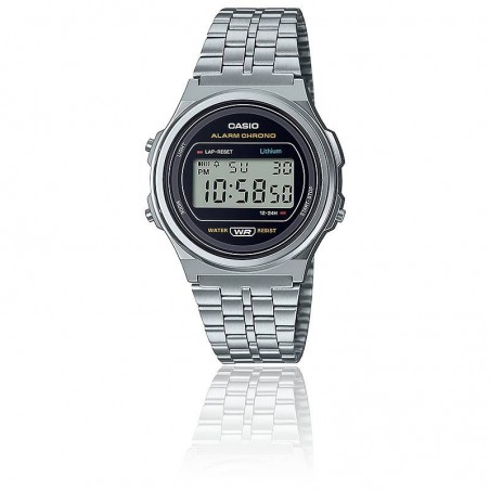 Ce modèle à quartz possède un bracelet en acier inoxydable gris et un boitier en résine au fond noir ainsi qu'un écran éclairé par une diode électroluminescente.