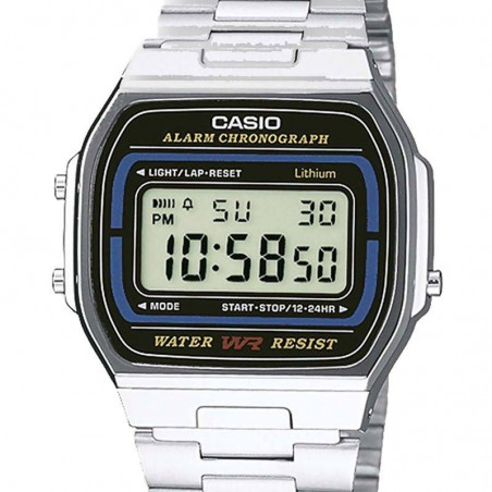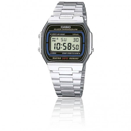 Ce modèle à quartz possède un bracelet en acier inoxydable et un boitier en résine avec un fond noir ainsi qu'un écran éclairé par une diode électroluminescente.