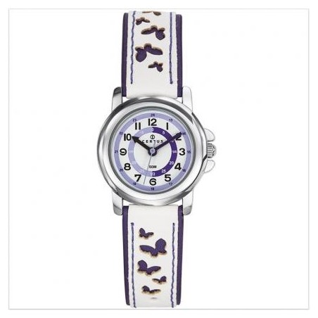 MONTRE CERTUS ENFANT EN CUIR BLANC AVEC PAPILLON CADRAN PEDAGOGIQUE