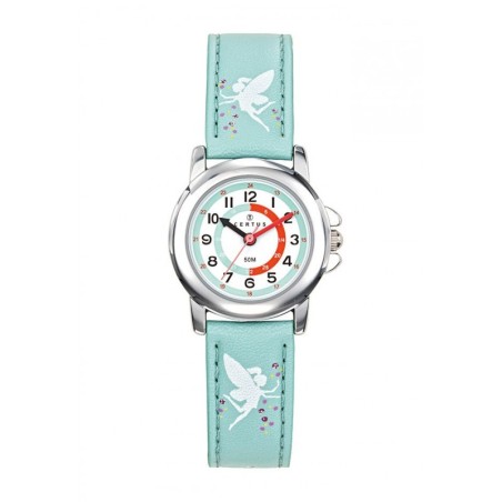 MONTRE CERTUS ENFANT EN CUIR BLEU PASTEL AVEC FEES CADRAN PEDAGOGIQUE