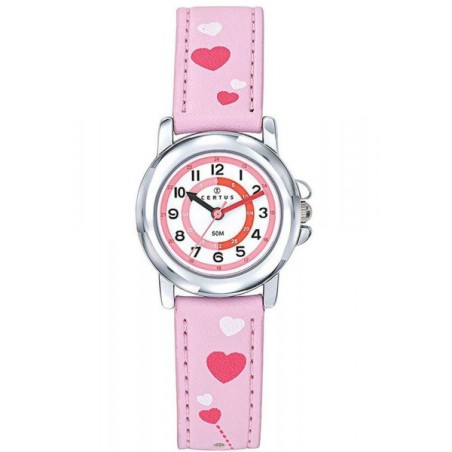 MONTRE CERTUS ENFANT EN CUIR ROSE AVEC COEURS CADRAN PEDAGOGIQUE