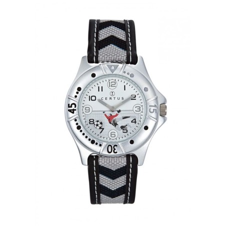 MONTRE CERTUS ENFANT EN TISSU GRIS ET NOIR MOTIF FOOT DANS CADRAN