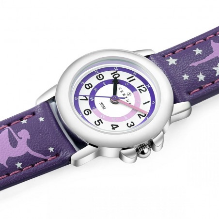 Elle possède un boitier rond en acier argenté de 26 mm et un bracelet en cuir violet motif ballerine.