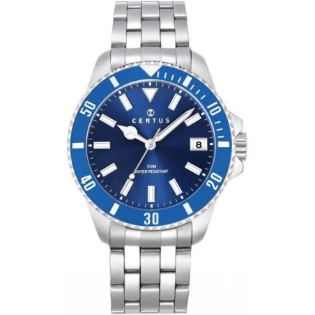 MONTRE CERTUS HOMME BRACELET ACIER DATEUR A 3H CADRAN ET LUNETTE BLEU
