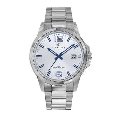 MONTRE CERTUS HOMME BRACELET ACIER DATEUR A 3H INDEX ET AIGUILLES BLEUS