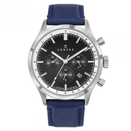 MONTRE CERTUS HOMME BRACELET CUIR BLEU CADRAN NOIR MULTIFONCTIONS