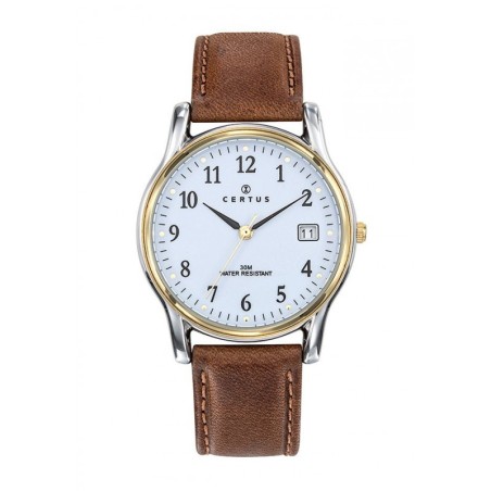 MONTRE CERTUS HOMME BRACELET CUIR MARRON BOITIER BICOLORE DATEUR A 3H