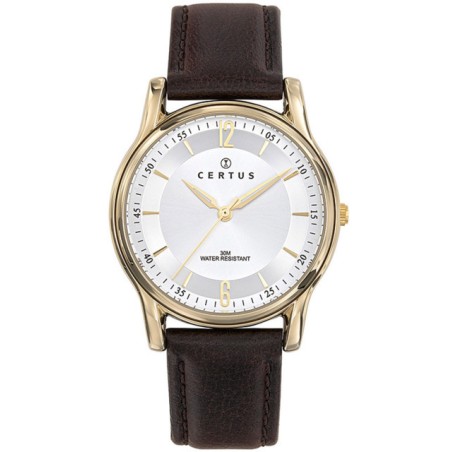 MONTRE CERTUS HOMME BRACELET CUIR MARRON BRUN BOITIER DORE CADRAN ARGENTE