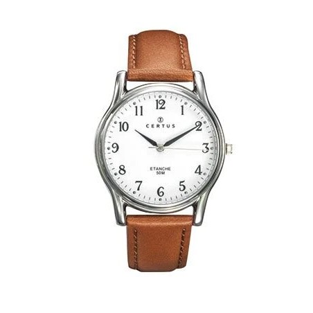 MONTRE CERTUS HOMME BRACELET CUIR MARRON CADRAN BLANC CHIFFRES ARABES