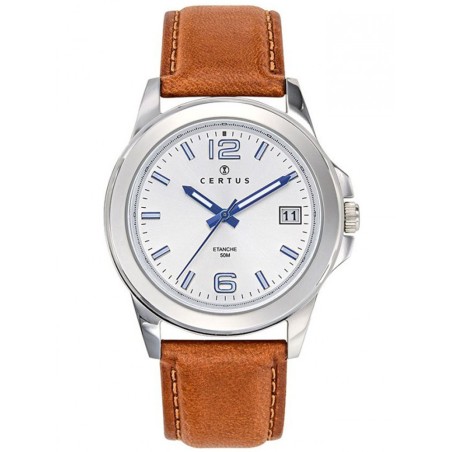 MONTRE CERTUS HOMME BRACELET CUIR MARRON CLAIR CADRAN BLANC INDEX ET AIGUILLES BLEUS DATEUR A 3H
