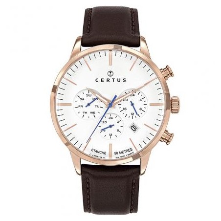 MONTRE CERTUS HOMME BRACELET CUIR MARRON FONCE CADRAN BLANC BOITIER DORE ROSE DATEUR ET CHRONOGRAPHES