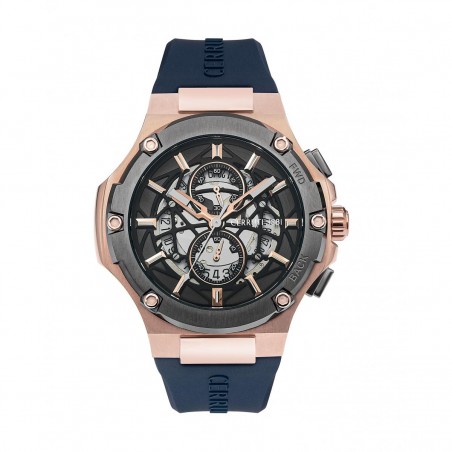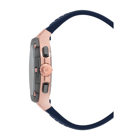 Ce modèle chronographe affiche un bracelet en silicone noir et un boitier de 44mm doré rose rehaussé d'une lunette grise anthracite au vis apparents.