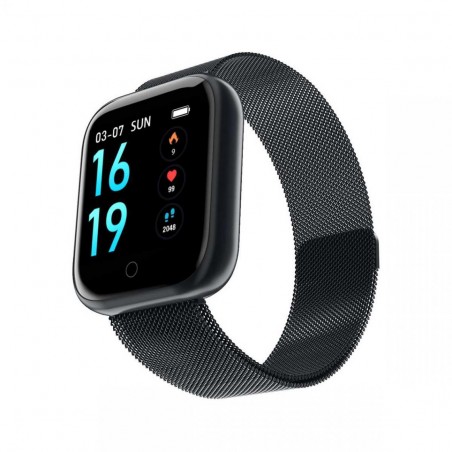 Ce modèle affiche un boîtier caré et deux bracelets un en silicone noir l'autre en acier en maille milanaise.