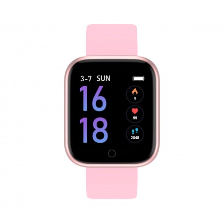 Ce modèle affiche un boîtier caré rose et un bracelet silicone et un deuxième en maille milanaise.