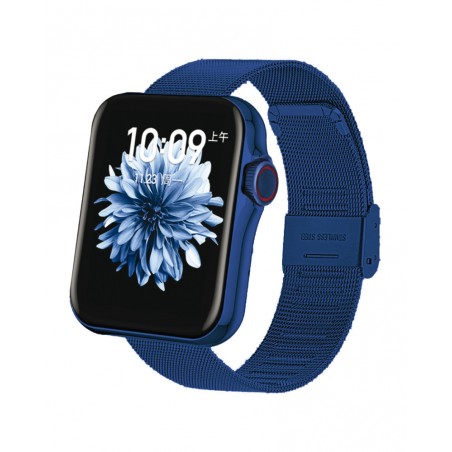 Ce modèle affiche un boîtier carré et un bracelet en maille milanaise bleue électrique.