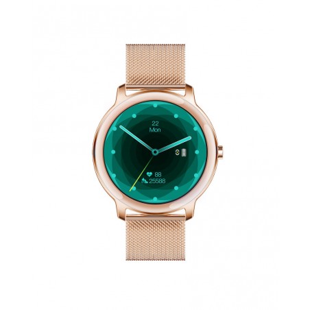 Ce modèle, élégance, affiche un boîtier rond et un bracelet en maille milanaise doré rose.