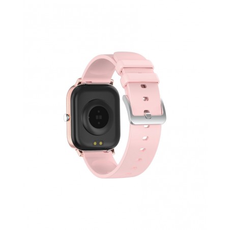 Ce modèle affiche un boîtier carré et un bracelet silicone rose.