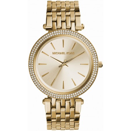 Son bracelet affiche une maille grain de riz fine et délicate qui enserre un boitier rond de 39mm surmonté d’une lunette sertie de deux rangées de strass.