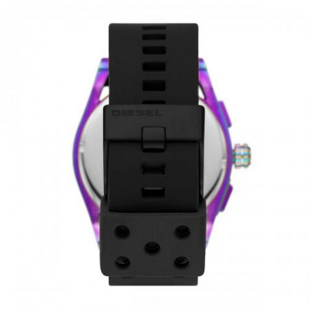 La montre se compose d'un boîtier de 48mm en forme de tonneau en acier violet et d'un bracelet en silicone noir.