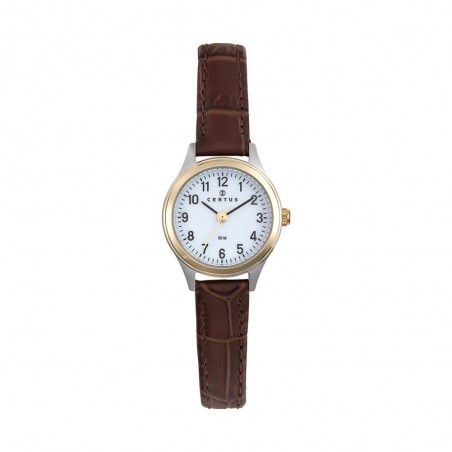 Ce modèle est à la fois chic et intemporel, se caractérisant par son boitier rond de 23mm en acier de couleur argentée et dorée.