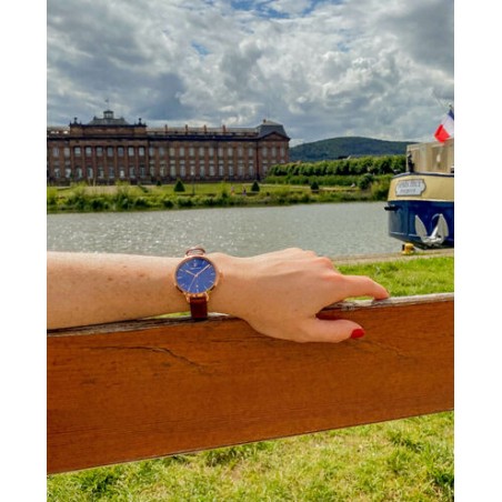 Son cadran bleu met en valeur les aiguilles ainsi que les index bâtons couleur or rose pour une lecture optimale.