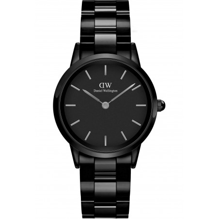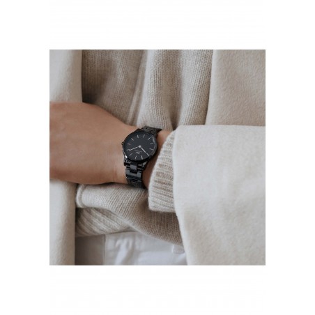 Elle possède un boitier de forme ronde et un bracelet en céramique noir.