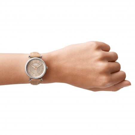 Agrémenté de cristaux sur la lunette, le modèle Carline by Fossil est une montre que l'on aimera porter sans modération! Son bracelet est en cuir couleur sable, son boitier acier et son cadran de couleur marron. Dimension du boitier : 35 mm.