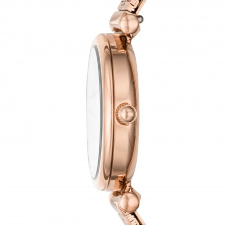 Craquez pour une montre chic et sobre avec la montre Mini Carlie signée Fossil. Le bracelet de cette montre est en acier doré rose révélant une jolie maille fantaisie. Son boitier doré rose sublime son cadran bleu miroir. Dimension du boitier : 28 mm