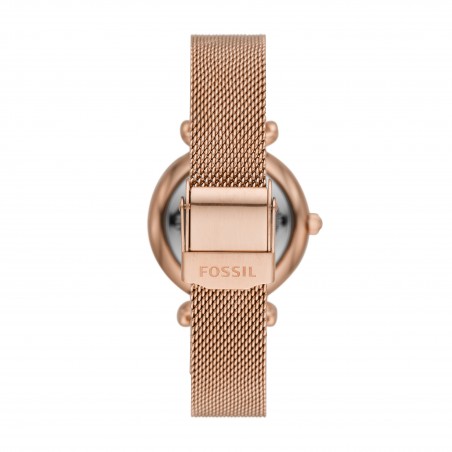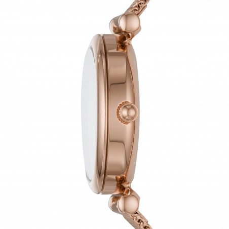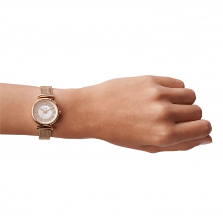 Le bracelet en acier présente une maille milanaise dorée rose.