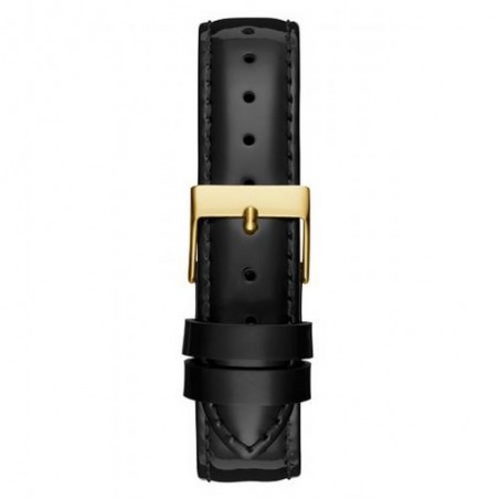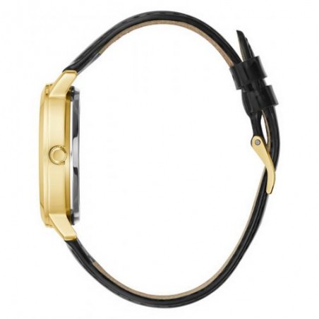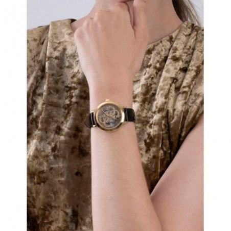 La montre se compose d'un boîtier rond de 36mm en acier doré et d'un bracelet en cuir de couleur noire.